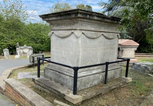Chest tomb. c1873, designer unknown, but carving by Kelsey. Portland stone. Rectangular plan on a moulded base. Side panels inscribed. Around the top, a continuous band of festooned bayleaves; above this the flat top forms an entablature with inscribed frieze and projecting cornice. All on a raised stone plinth with square plan iron railings by J. Mills of 40 Great Russell St.