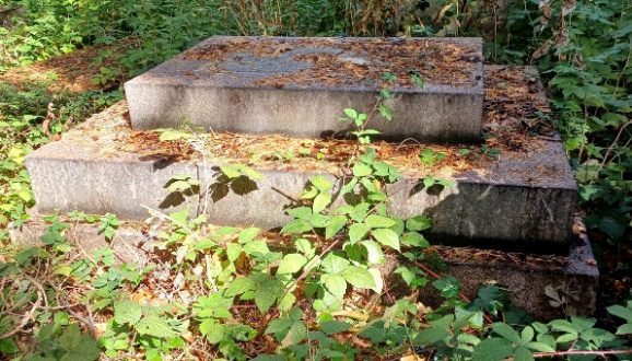 Cross on pedestal with grave slab. c1904, manufactured by Doulton of Lambeth. Mottled blue and buff ceramic. Gadroon enriched base carries rectangular pedestal with inset panels; surmounted by blue ceramic cross with paterae. Stone grave slab with blue ceramic kerb.