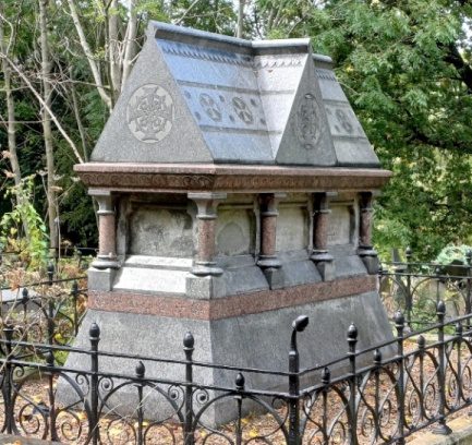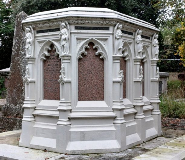 Chest tomb, c1847, designer unknown. Cast iron, stucco and pink granite. Rectangular stepped base with mitred corners having pedestals supporting pilasters with Gothic aedicules and surmounted by cast figures of standing angels. Pilasters flank pointed, cusped openings filled with pink granite slabs, some inscribed. Enriched, coved cornice to flat top with moulded edges. The whole stands on a large stone platform, now badly broken, but originally with good Gothic wrought iron railings.