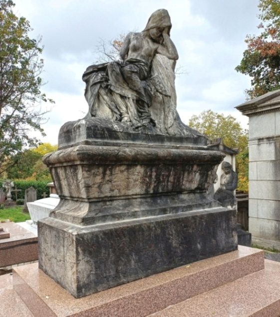 Sarcophagus with figure. c1908, designer unknown. Pink granite and polychrome and white marble. Stepped pink granite base supports veined marble plinth with sarcophagus, both inscribed; topped by a white marble sculptured, half nude, languidly seated female figure with flowing robes and veiled head supported on left hand, abandoning herself to grief. To the rear, pink granite steps lead down to the vault.