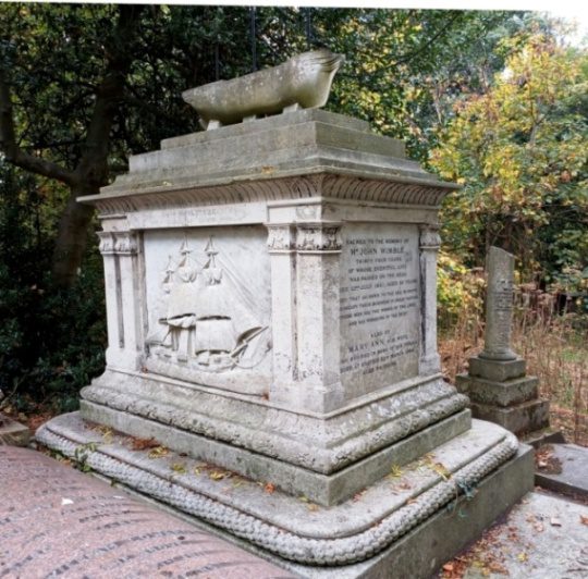Chest tomb, c1851, designer unknown. Stone. Rectangular, enriched, stepped base, with thick band of carved ship’s rope moulding, supporting tomb with paired clasping pillasters, having palmette capitals, at angles supporting a coved cornice with acanthus enrichment. Stepped top surmounted by a sculptured dismasted merchantman. 3 side panels with fine quality relief carvings of ships at sea, two in violent storms; panels inscribed “Ship Maidstone off St. Helena 24 March 1840”, “Ship London off Gangan 6th October 1832” and “Ship Florentinia off the Cape 21 June 1825. Wimble spent 34 years at sea before retiring.